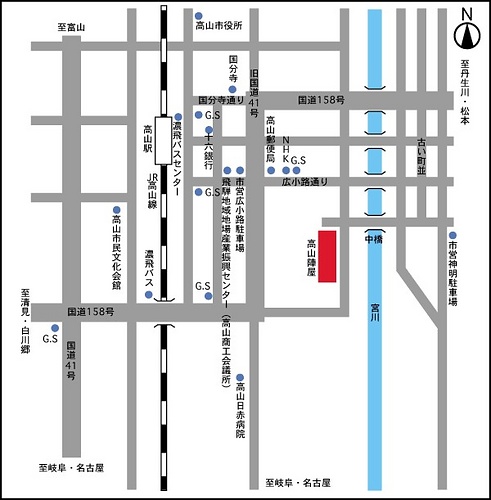 JR高山本線高山駅下車・徒歩10分:東海北陸自動車道飛騨清見IC経由中部縦貫道高山西ICから20分(専用駐車場はございませんので、周辺駐車場をご利用ください。)