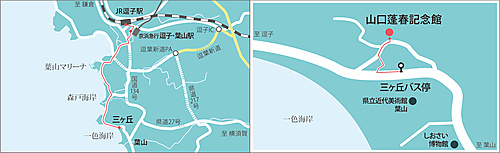 JR横須賀線・湘南新宿ライン「逗子駅」より京浜急行バス3番乗場、又は京浜急行線「逗子・葉山駅」南口2番乗場より「海岸回り葉山行(逗12)」か「海岸回り葉山福祉文化会館行(逗11)」にて約20分「三ヶ丘・神奈川県立近代美術館前」下車徒歩2分。※当館には専用駐車場がございませんので、周辺の有料駐車場をご利用くださいますようお願いいたします。
