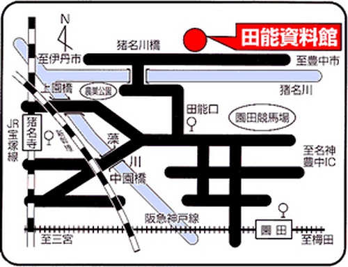 園田駅北側4番のりばより、尼崎市バスJR猪名寺ゆき(20番)・阪急塚口ゆき(21・21-2番)・阪神尼崎ゆき(22番)ともに「田能口」下車、北へ徒歩約15分