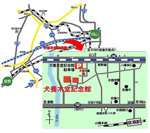 電車:JR山陽本線庭瀬駅下車 タクシー5分または徒歩25分