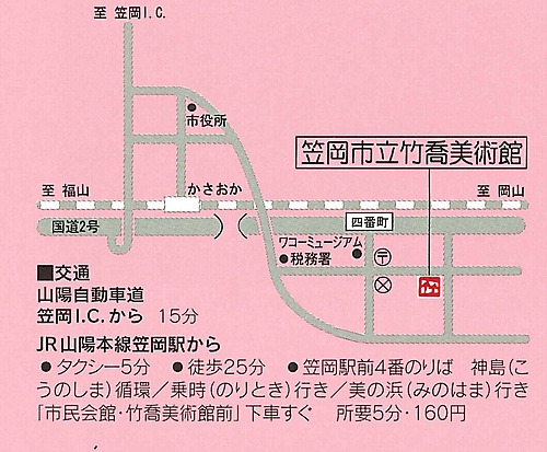 ・井笠バス 神島循環 もしくは 乗時行き、美の浜行き、「市民会館・竹喬美術館前」下車すぐ
