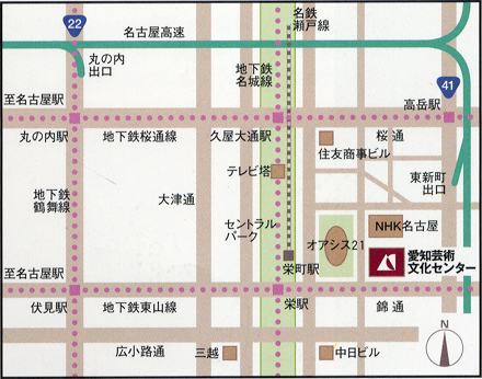 地下鉄東山線・名城線「栄」駅、名鉄瀬戸線「栄町」駅下車、オアシス21連絡通路利用、徒歩3分