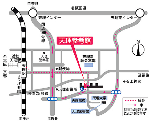 電車:JR桜井線・近鉄天理線天理駅下車 徒歩約20分、車:西名阪道天理I.C.より南へ3km 駐車場あり※時期により駐車を制限する場合があります