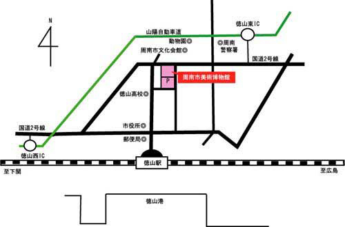 徳山駅よりバス:バイパス経由花岡行、バイパス経由下松駅北口行、金剛山じゅんかん「動物園文化会館入口」下車、水・金・土・日・祝日は1時間ごとに街なかふれあいバス「ぐるぐる」運行「美術博物館前」下車徳山駅から徒歩20分、徳山駅からタクシー約5分:山陽自動車道徳山東ICから国道2号線を西進、約10分:山陽自動車道徳山西ICから国道2号線を東進、約20分