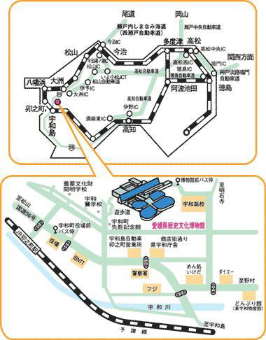 JR松山駅から(特急約1時間)JR卯之町駅下車、JR卯之町駅から徒歩(遊歩道利用)で約20分、車で約5分