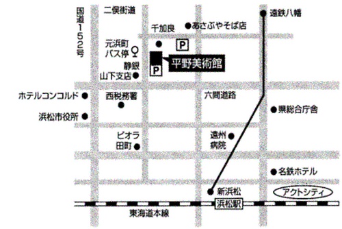 JR浜松駅北口を出て、遠州鉄道バス乗り場(12番乗り場)から 《内野台行》乗車、《元浜町》下車すぐ(乗車時間約8分)