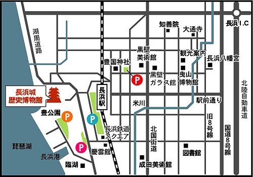 JR北陸本線「長浜駅」から徒歩5分。北陸自動車道「長浜IC」から車で15分。