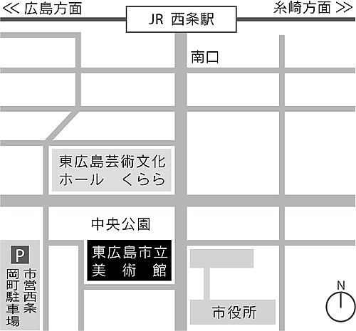 ■JR山陽本線「西条駅」南口から約400m(徒歩約10分) ■JR山陽新幹線「東広島駅」からバス(西条駅行き)「中央公園前」下車すぐ(バス約20分) ■山陽自動車道「西条インターチェンジ」から約7分 ※車でご来館の際は近隣の駐車場をご利用ください。市営西条岡町駐車場をご利用の方は、駐車料金が2時間無料になります。