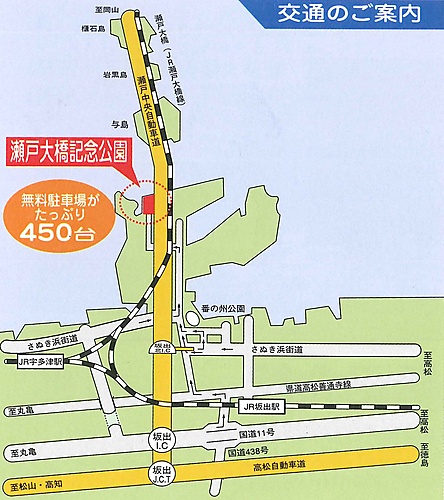 ○瀬戸大橋を渡って、車でお越しの場合→坂出北インターから3km・浜街道番の州交差点を北へ ○四国方面から、高速道路を利用する場合→坂出インターから9km・浜街道番の州交差点を北へ ○JRで→坂出駅下車・バスかタクシーで15分