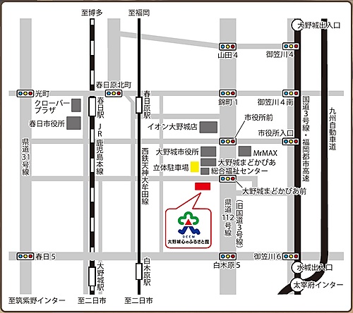 ◆公共交通機関でお越しの場合 西鉄福岡(天神)駅から春日原駅まで急行約12分 西鉄春日原駅より徒歩約12分 西鉄下大利駅より西鉄バス イオン大野城行き乗車「大野城市役所」下車徒歩約3分 JR博多駅から大野城駅まで快速約13分 JR大野城駅よりコミュニティバス 大城ルート乗車「まどかぴあ」下車すぐ ◆お車でお越しの場合 九州自動車道太宰府IC大野城方面出口より約6分 福岡都市高速大野城出入口から大野城方面約10分 ※心のふるさと館の専用駐車場はありません。 駐車場は隣接する大野城まどかぴあ駐車場(無料)を利用してください。 ※駐車可能台数に限りがありますので、できる限り公共交通機関を利用してください。 ※大型バスでお越しの場合、駐車許可証が必要となりますので事前に館までお問い合わせください。