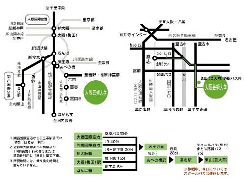近鉄南大阪線河内長野行き「喜志」駅下車、スクールバスまたは金剛バス阪南ネオポリス行き「東山(芸大前)」下車すぐ:西名阪自動車道藤井寺ICより20分