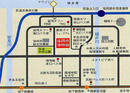 バス:博多バスターミナル5・6番のりばから約35分、天神高速バスターミナル前1Aのりばから約20分。福岡タワーまたは博物館北口、博物館南口下車徒歩5分。