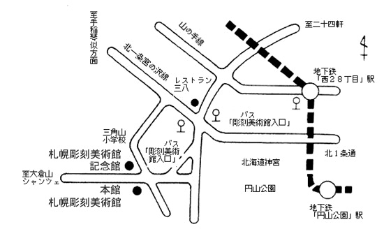 地下鉄東西線「西28丁目」駅下車,2番出口バスターミナル3番乗場からジェイ・アール北海道バス山の手線<循環西20 神宮前先回り>に乗車~「彫刻美術館入口」下車,山方向に徒歩約10分